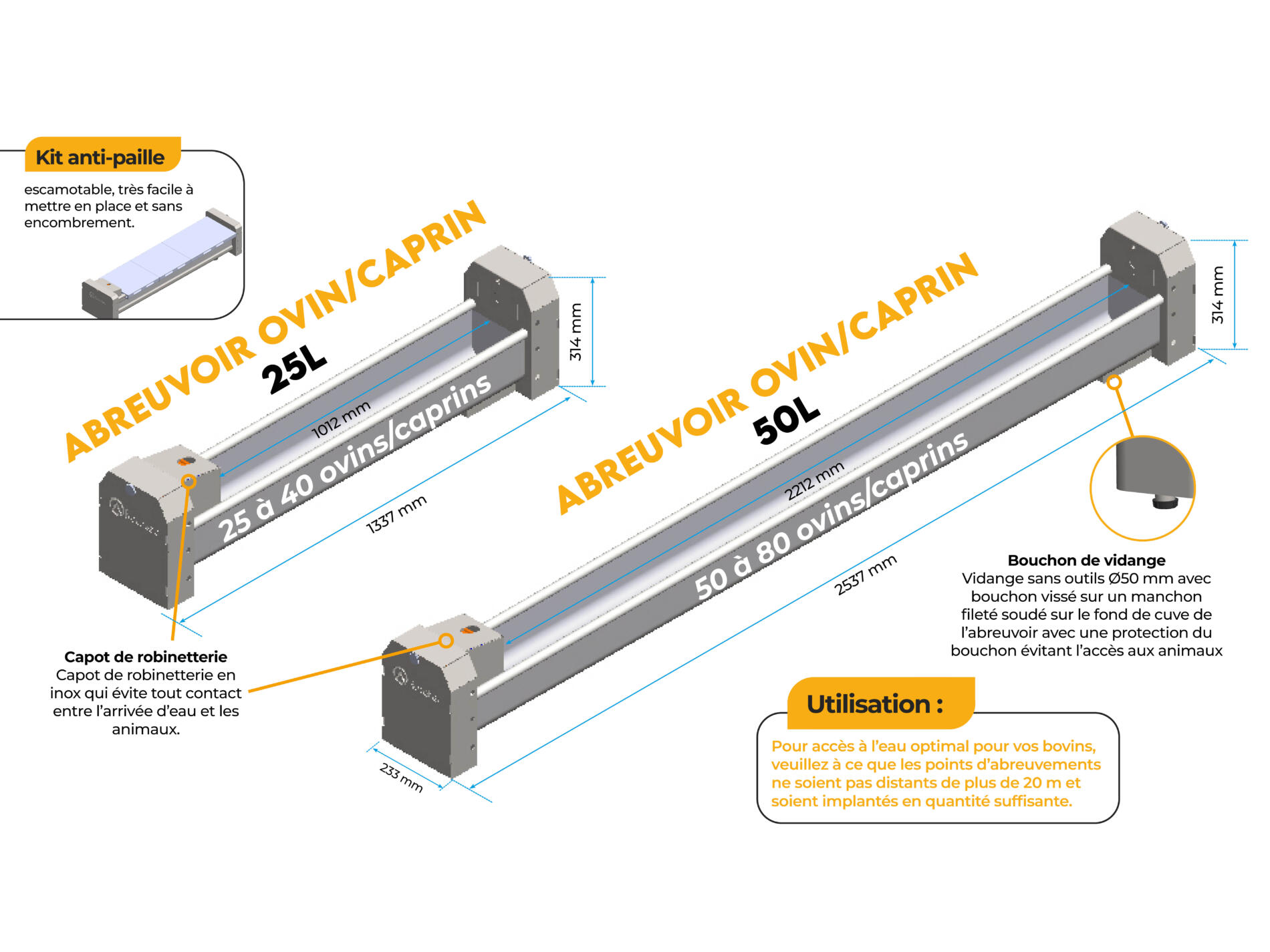 - Dimensions abreuvoir : L 786 mm X l 529 mm X H 384 mm (l = largeur ou profondeur de l’abreuvoir)