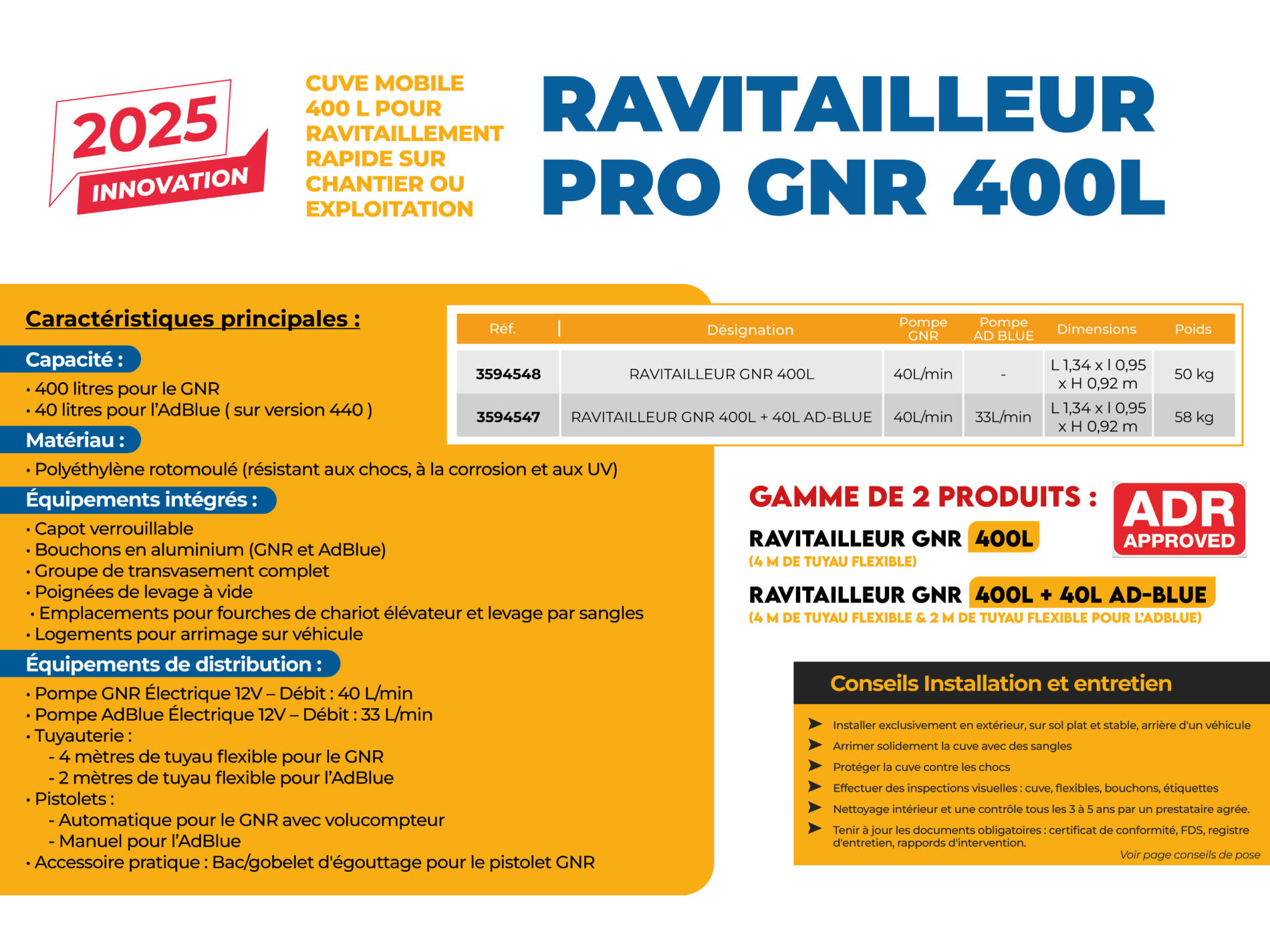 - 3594548 RAVITAILLEUR GNR 400L, débit 40L/min, dimensions de L 1,34 x l 0,95 x H 0,92 m pour un poids de 50 kg
