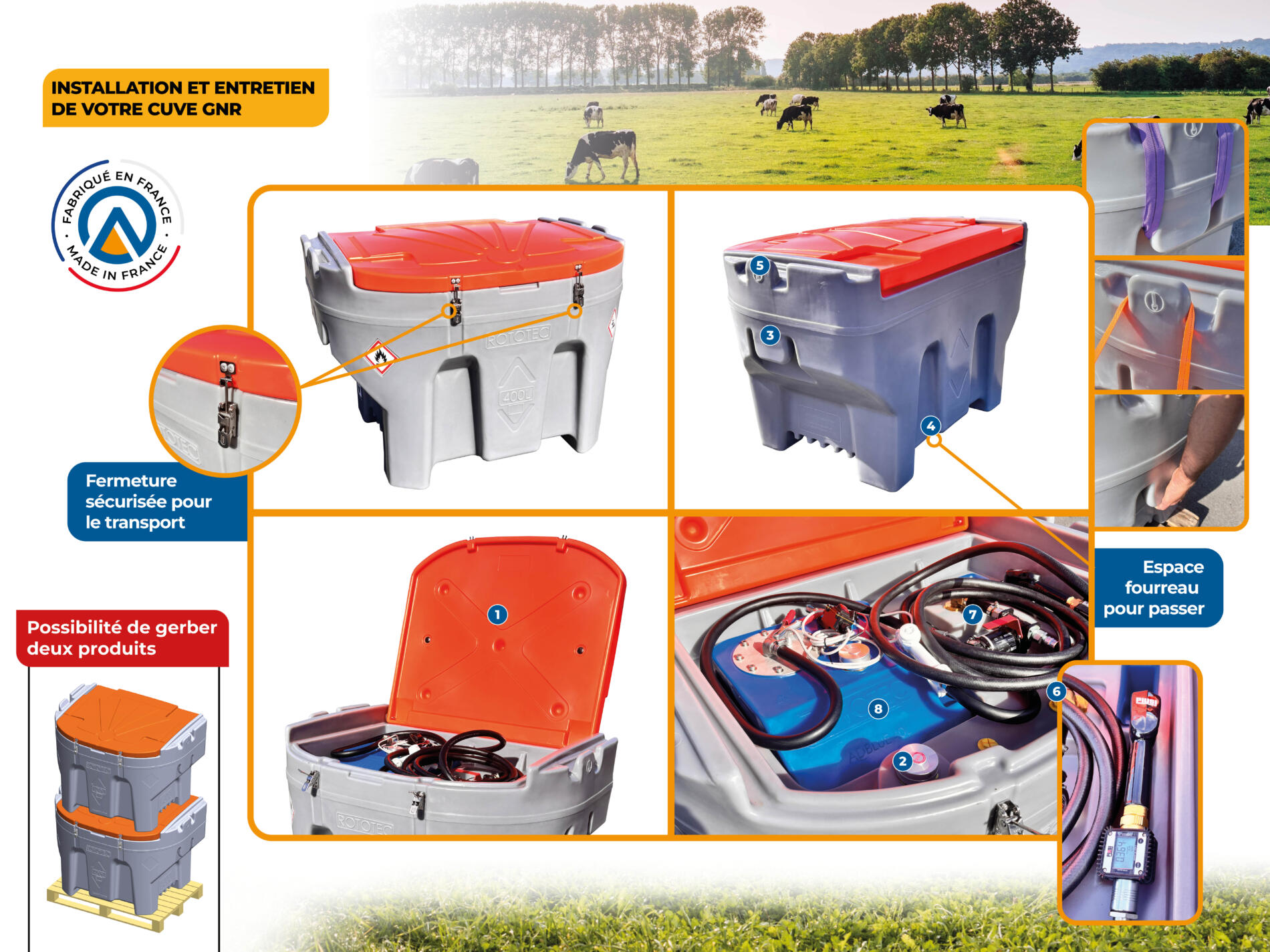 Leur conception monobloc et leur accès aisé permettent l’intégration d’équipements de distribution (pompes, pistolets, jauges, filtres), pour un usage quotidien fiable et pratique. Elles conviennent aussi bien pour une installation en extérieur qu’en bâtiment fermé.