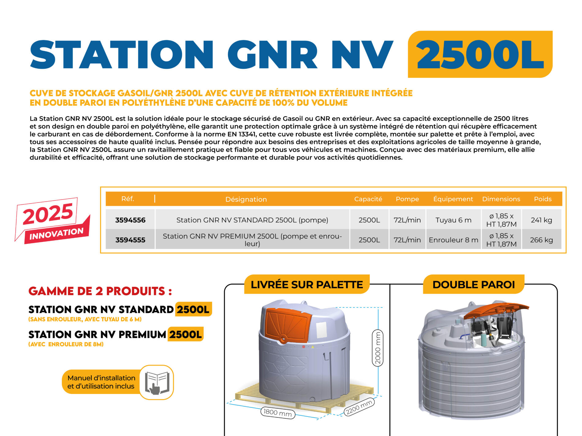 - 3594556 STATION GNR STANDARD 2500L (pompe), débit 72L/min, Tuyau de 6 m, dimensions de ø 1,85 x HT 1,87M pour un poids 241 kg