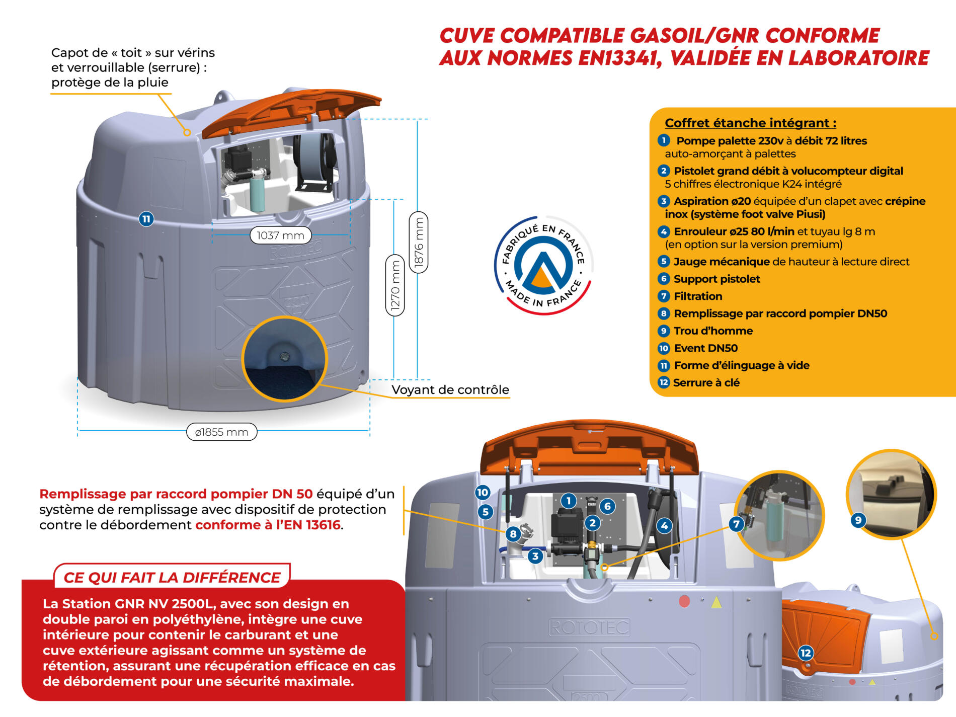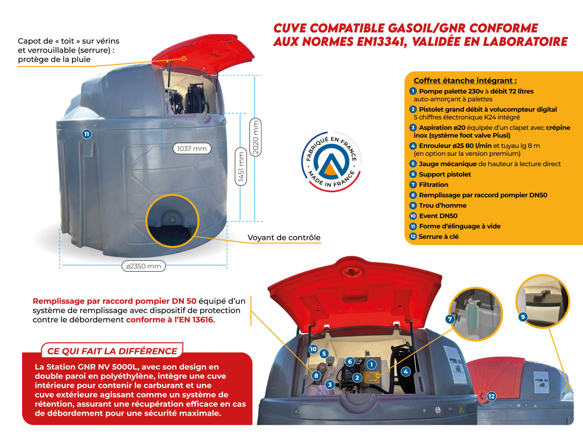 - Cuve Compatible Gasoil/GNR Conforme aux Normes En13341, validée en laboratoire