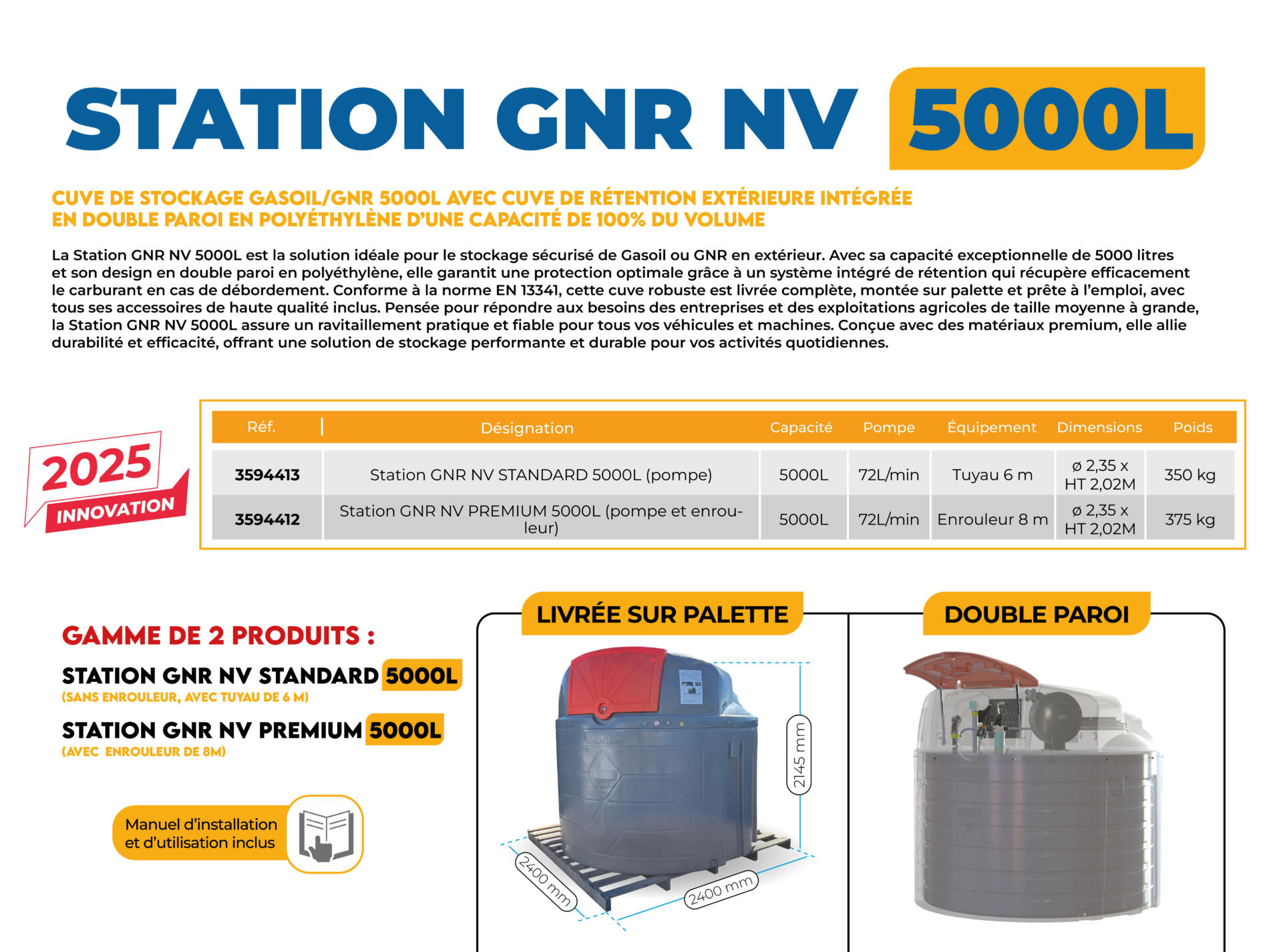 - 3594413 STATION GNR 5000L (pompe), débit 72L/min, Tuyau de 6 m, dimensions de ø 2,35 x HT 2,02M pour un poids 350 kg